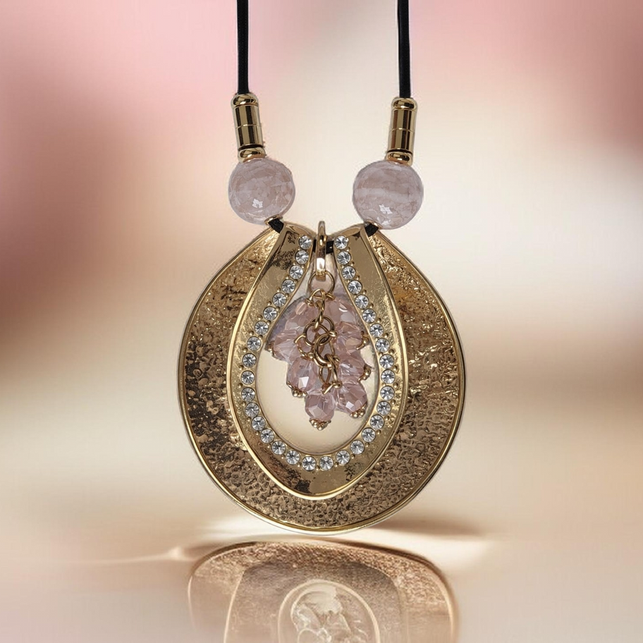 At its centre sits a gold-tone pendant, framed with delicate crystals and soft pink accents, creating a balance between something bold and something quietly feminine.
