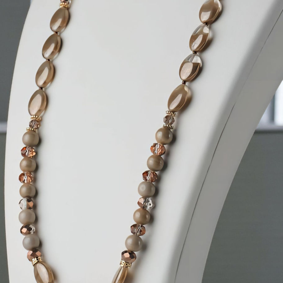 Introducing the Golden Mist necklace: smooth warm-toned oval beads in soft amber hues, interspersed with faceted crystal accents and gold-plated spacers for a subtle sparkle. Each bead catches the light with a gentle glow, while the streamlined length gives it effortless style. Finished with a secure heart-shaped sterling-silver magnetic clasp, this piece blends comfort and craftsmanship with quiet sophistication.