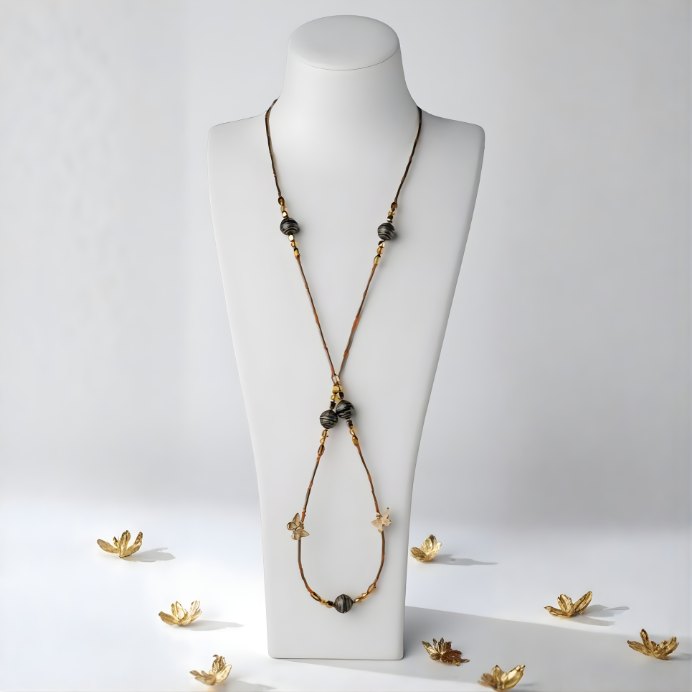 The Savannah Whisper necklace brings together natural warmth and metallic elegance in a design that feels both grounded and refined. It features etched black ceramic beads, gold-plated butterfly charms, and a delicate mix of bronze and amber Czech glass for subtle shimmer.