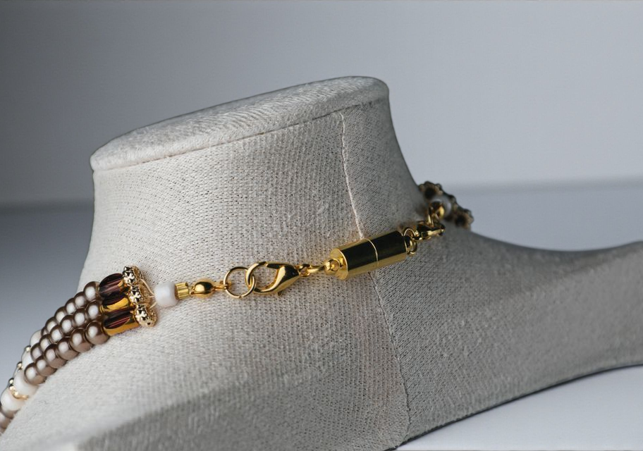 The Mocha Radiance necklace exudes refined elegance with its triple-strand design of bronze-toned and ivory glass pearls. Each strand is interspersed with gold accents and crystal rondelles, creating a soft shimmer that catches the light beautifully.