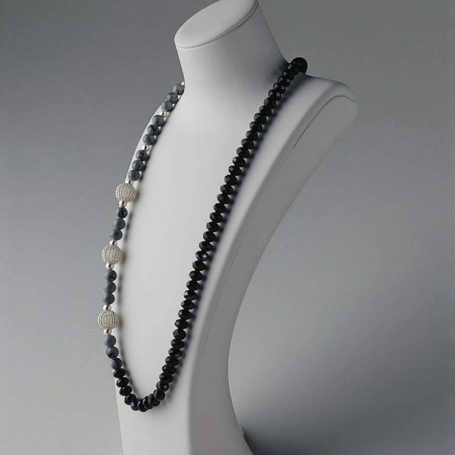 The Graphite Balance necklace is defined by contrast, balance and texture. Faceted black beads form a sleek, continuous line, offset by soft grey marbled beads and sculptural silver-toned accents that introduce rhythm and visual interest throughout the design. The overall effect is modern and architectural, yet understated and wearable.