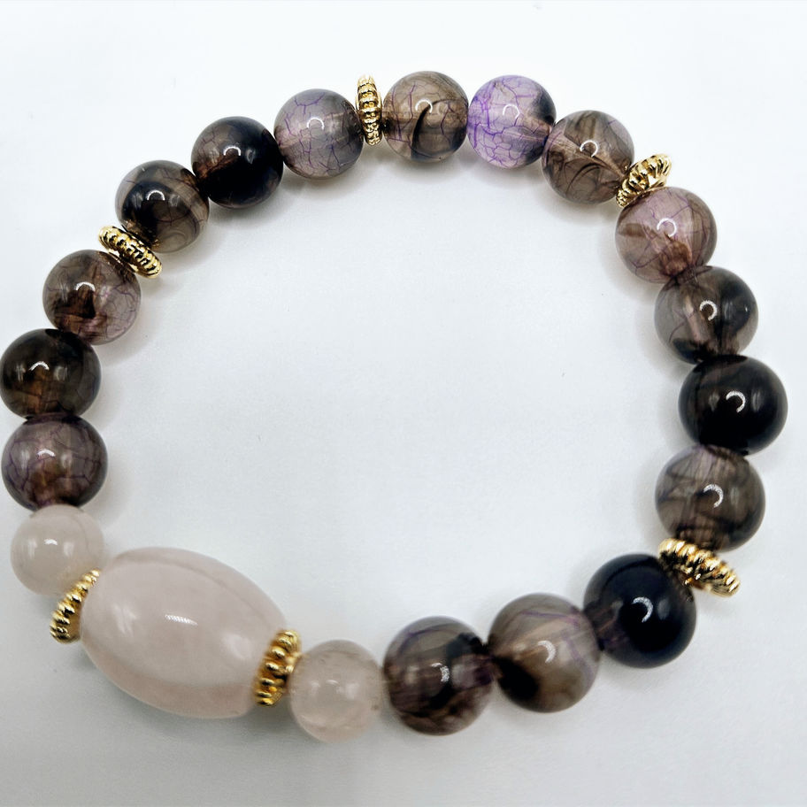 Blush Tide brings together gentle rose tones and cool, misty greys in a design that feels calm and considered. The bracelet is centred around a smooth, oval blush bead that anchors the piece, surrounded by softly marbled beads in muted coastal hues. Each element is spaced with real 14-carat gold-plated spacers, adding warmth and definition without overpowering the palette.